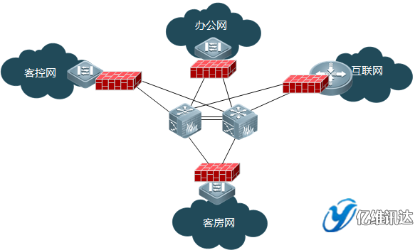 通過銳捷核心交換機(jī)的防火墻模塊的虛擬防火墻功能,對客控網(wǎng)、客房網(wǎng)、辦公網(wǎng)進(jìn)行安全防護(hù),將病毒/攻擊隔離在本地,不影響其他區(qū)塊正常運(yùn)行。